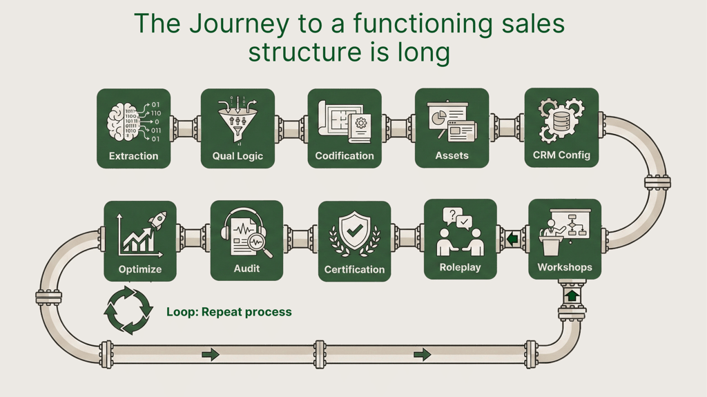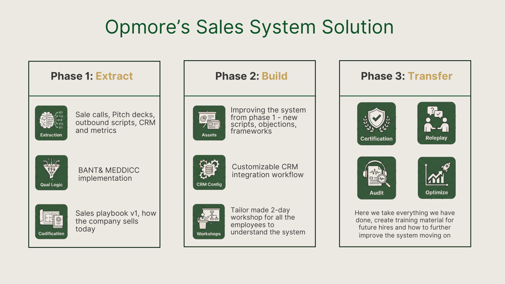 This is the step before building or transferring anything. We extract how your sales system operates today so it can be improved, scaled, or delegated safely.